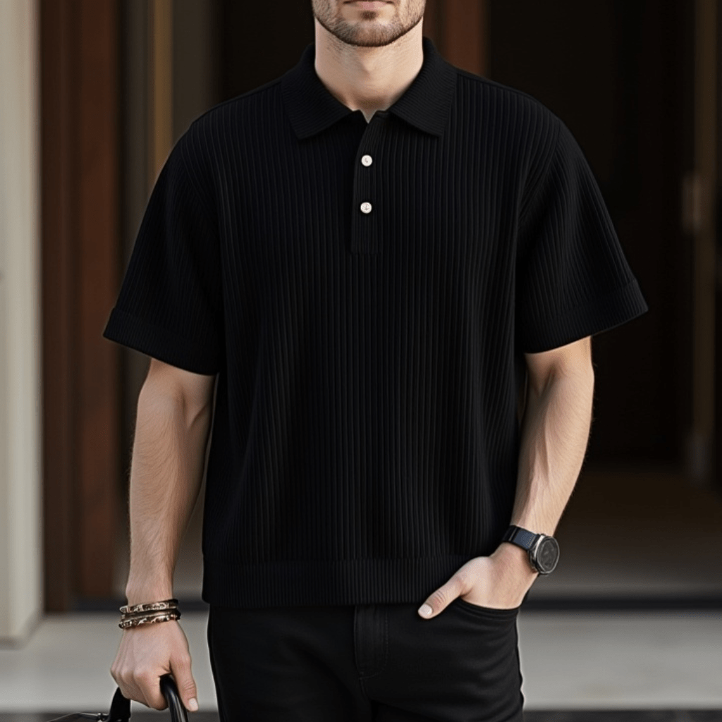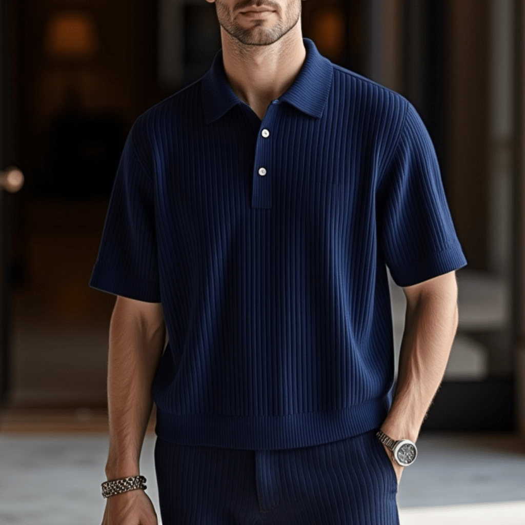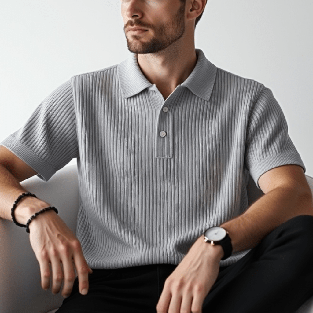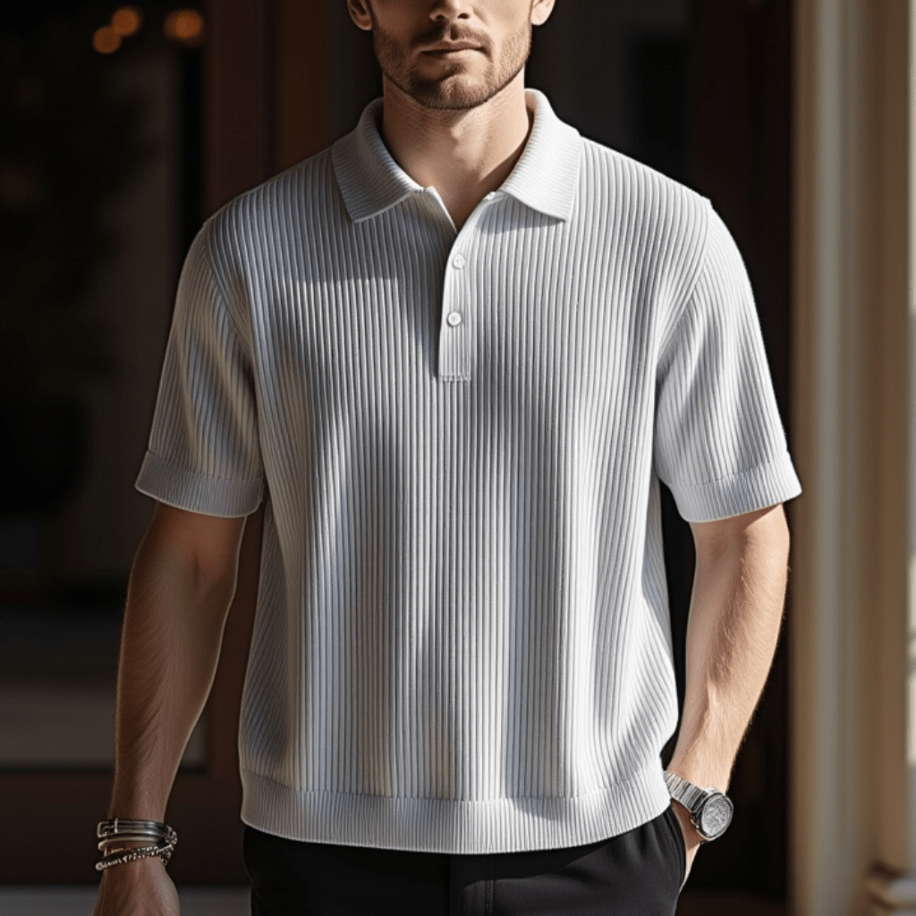 The Enzo Shaker Shirt combines shaker-stitch texture and bold horizontal ridges for a modern, structured look. Short sleeves add a relaxed touch while maintaining a polished appearance. The clean, buttonless placket and tonal folded collar provide a refined finish. Elevate your style with this versatile and sophisticated shirt.