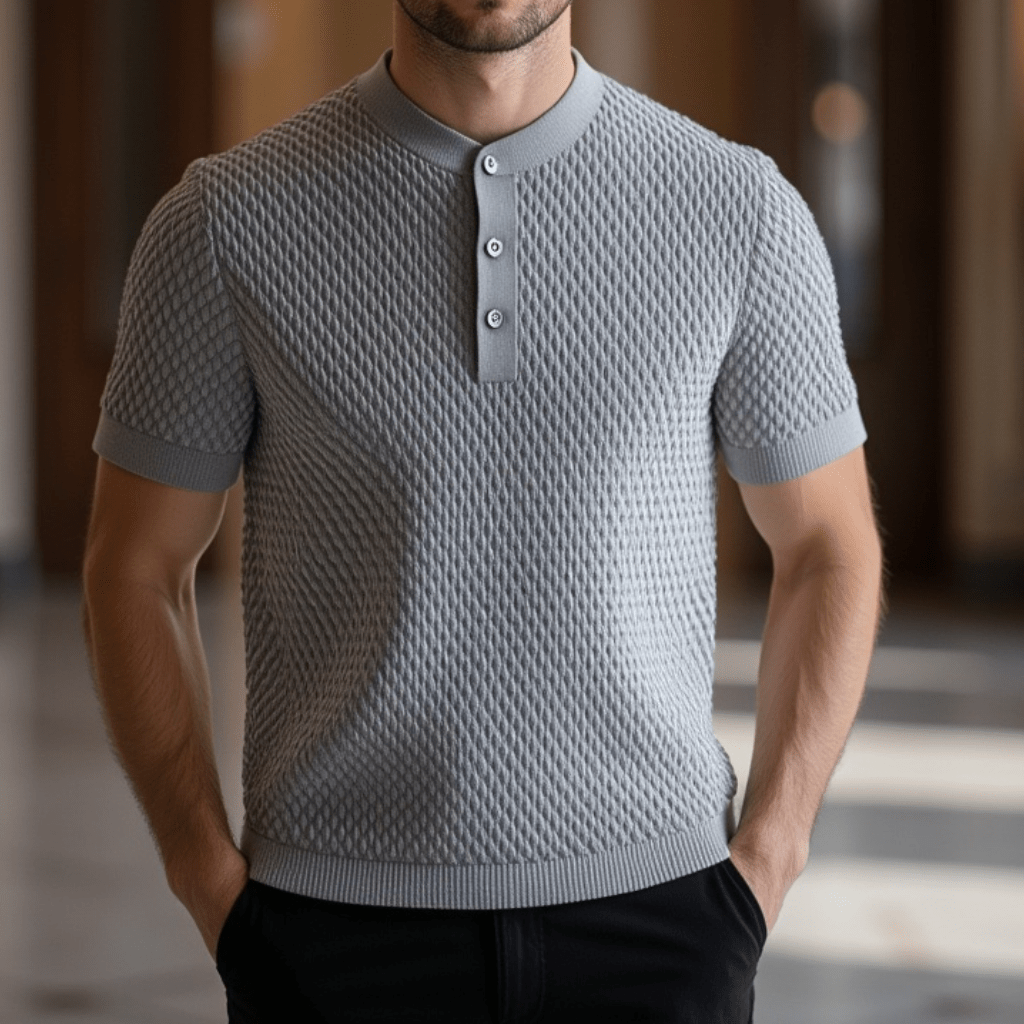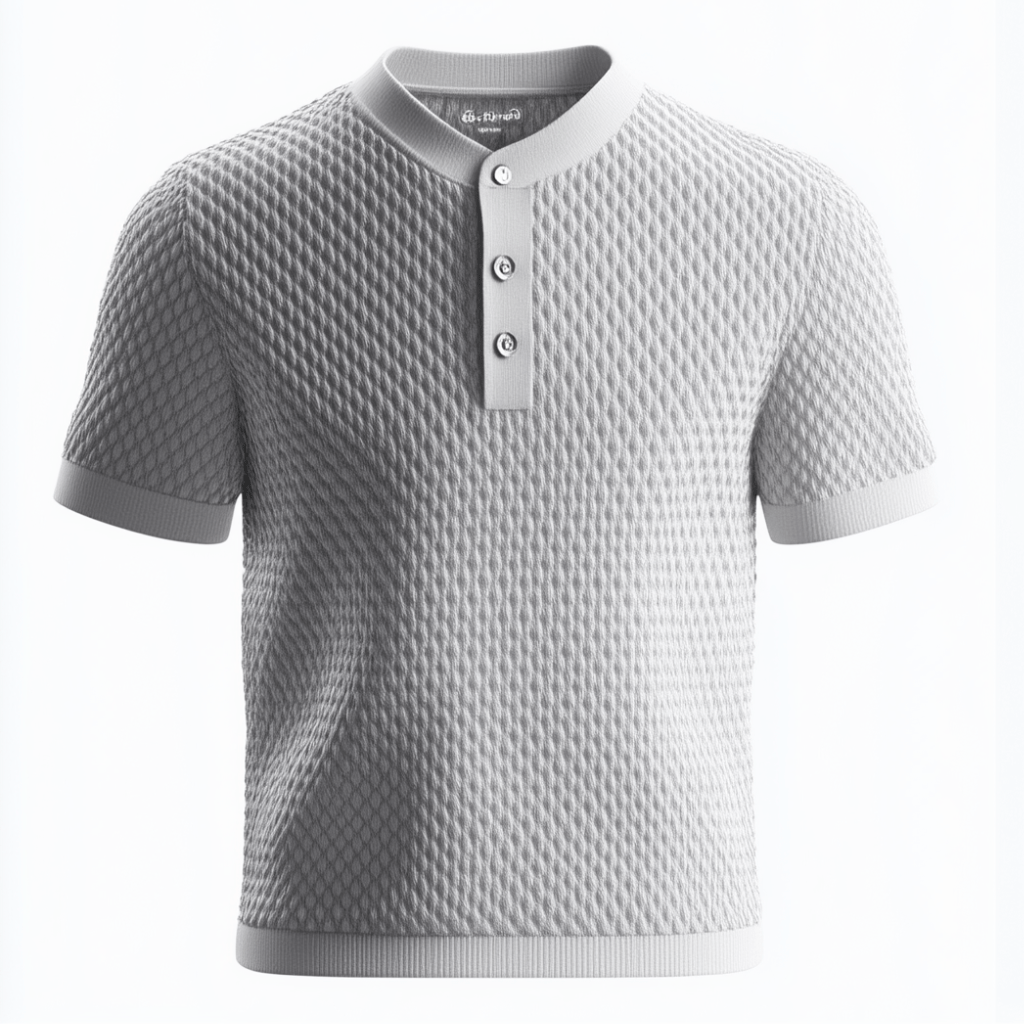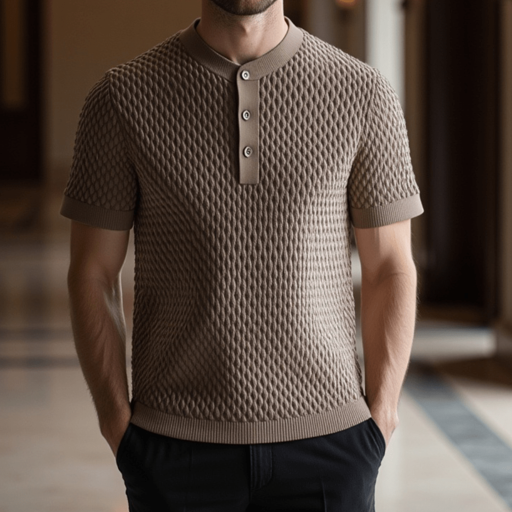 Introducing the Franfurt Knit Shirt. This expertly designed shirt features a basket-weave knit texture for a structured and breathable feel. With short sleeves for a relaxed yet polished silhouette, a crewneck with a functional 3-button closure, and four refined color options, this shirt offers versatility and style. Choose from Slate Blue, Light Gray, Warm Taupe, or Jet Black for a sophisticated look every time.
