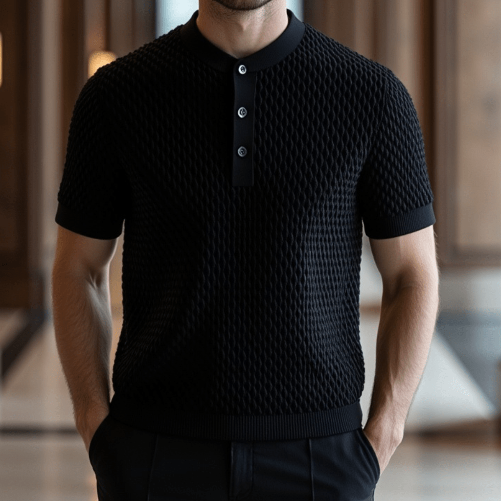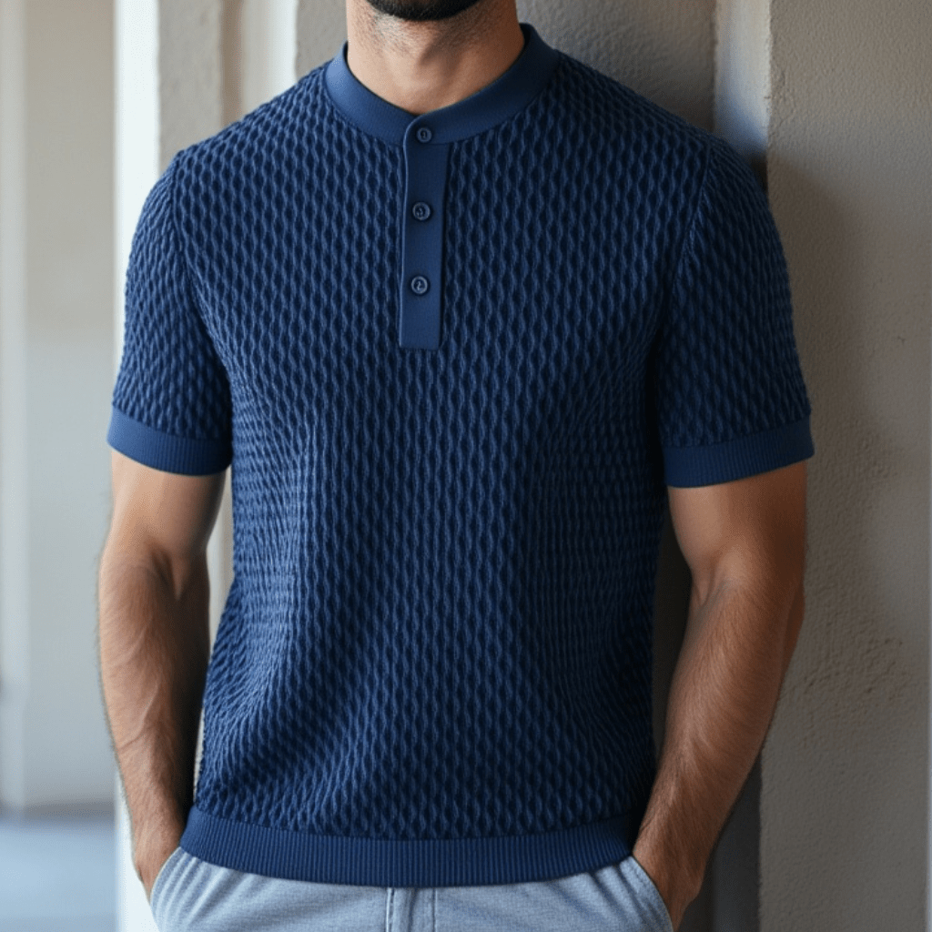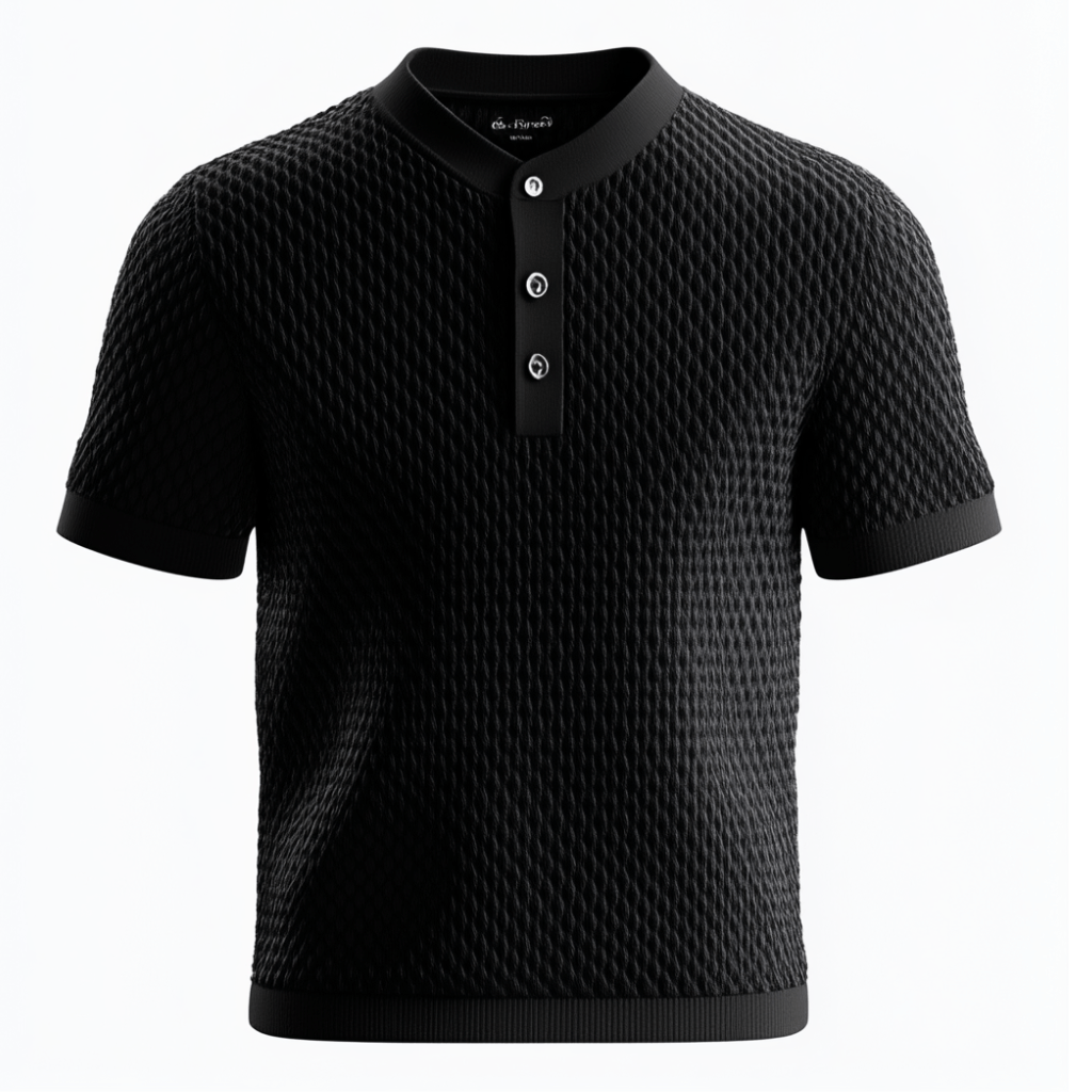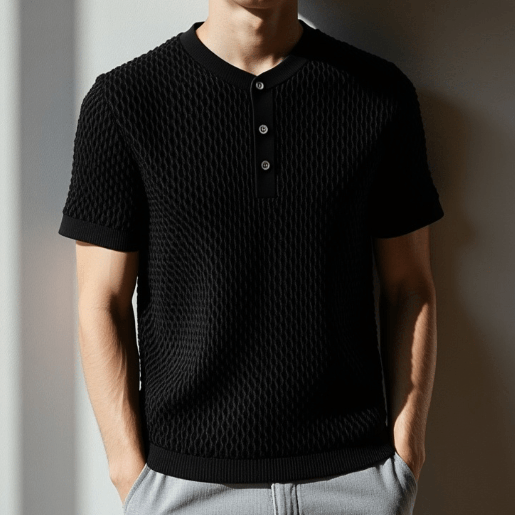 Introducing the Franfurt Knit Shirt. This expertly designed shirt features a basket-weave knit texture for a structured and breathable feel. With short sleeves for a relaxed yet polished silhouette, a crewneck with a functional 3-button closure, and four refined color options, this shirt offers versatility and style. Choose from Slate Blue, Light Gray, Warm Taupe, or Jet Black for a sophisticated look every time.